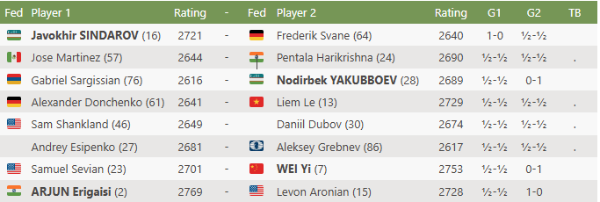 Do stejné fáze turnaje se přidávají i dva uzbečtí hráči – Nodirbek Jakubbojev a Javokhir Sindarov. První z nich vyřadil Gabriela Sargissiana, druhý zase Frederika Svaneho. Jeden by skoro řekl, že Uzbekistán poslal na turnaj malou šachovou jednotku a ta si zatím vede výborně.