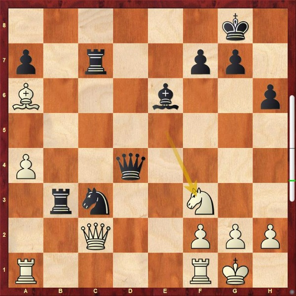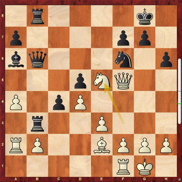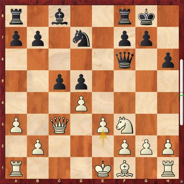 18... Sa6!? Zaujímavý spôsob, ako zvýšiť okamžite tlak na pozíciu bieleho. Čierny chce zapojiť do hry poslednú figúru, ktorá bude napadať navyše slabého pešiaka na b2. Čím prinúti ho ku pasívnej obrane. 19... 0-0 Vb8 20... Df5?! Biely sa snaží o protiútok, ale toto nie je najlepšie. Čierny si poradí s tým už hravo. 20... Jf6 21. Je5 Biely aktivizuje figúry. V skutočnosti je to o niečo horší plán. Prečo?