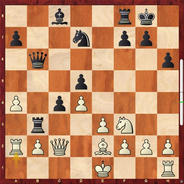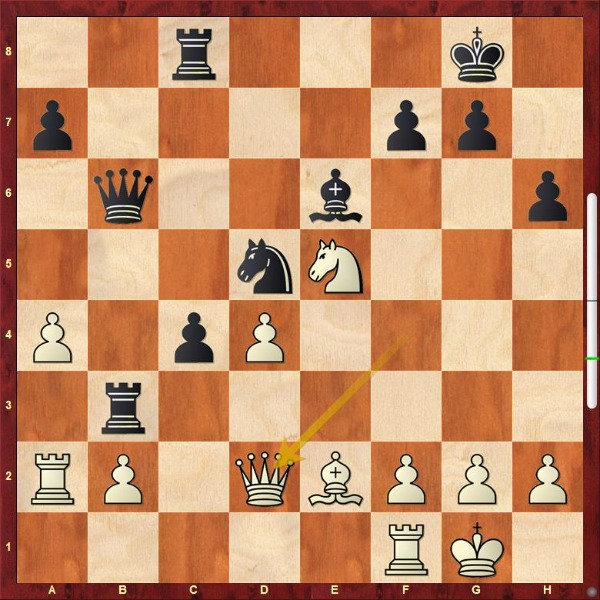 25... Db4! Áno, čierny by prešiel rád do vyhranej koncovky. Biely si uvedomuje však, že koncovka nie je lákavá. 26... Dc2 Tu biely nič nemá, ale niečím to už zaváňa, keď dámou musí ísť takto pod vežu. 26... c3! Toto je zdrvujúce. Čierny má v rukách všetky tromfy. 27... Sa6 Vb7?? A je tu hrubá chyba. Okamžite vyhrávalo 26. cxb2. Takto sa musí bojovať tvrdo ešte. 28... bxc3 Opäť najsilnejšia obrana. 28... Jxc3 29. Vaa1 Dxd4!? Zaujímavé. Zdalo sa, že biely sa vymanil z tlaku. A už v nasledujúcom ťahu príde hrubá chyba. 30... Jf3?? Správne bolo 29. Vfe1 a biely nemá veľké starostí. Takto prichádza pomaly záver partie.