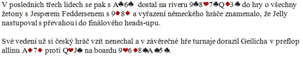 Čeští hráči mají na Deauville příjemné vzpomínky. V nejdražším High Rolleru tu v minulosti triumfovali Martin Kabrhel (250 000€ ) a Vojtěch Růžička (313 000€). Tentokrát vyšly české barvy z hlavního turnaje i z High Rolleru naprázdno, ale krásný úspěch zaznamenal ve vedlejším turnaji s buy-inem 2 200€ kouč výukového webu PokerArena.cz Petr „Jelly“ Jelínek. Už z prvního dne dvoudenního turnaje se 193 účastníky postupoval na průběžné 11. příčce a k finálovému stolu usedal jako chipleader s téměř čtvrtinou všech žetonů ve hře.