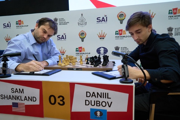 Daniil Dubov už před zápasem říkal, že jeho cílem je dostat duel do tiebreaku, protože rychlejší partie mu dlouhodobě sedí. Sam Shankland však dnes nastavil tempo tak, že Dubov neměl kde hledat protihru. V první rychlé partii Američan získal výhodu hned po zahájení a bez problémů ji dovedl do konce. Druhá partie se po výměně dam tvářila jako remíza, ale Dubov v závěru příliš riskoval a Shankland toho využil i podruhé.  Po zápase připomněl své nešťastné vyřazení ve čtvrtfinále v roce 2021 a poznamenal, že letos to chce konečně zlomit.