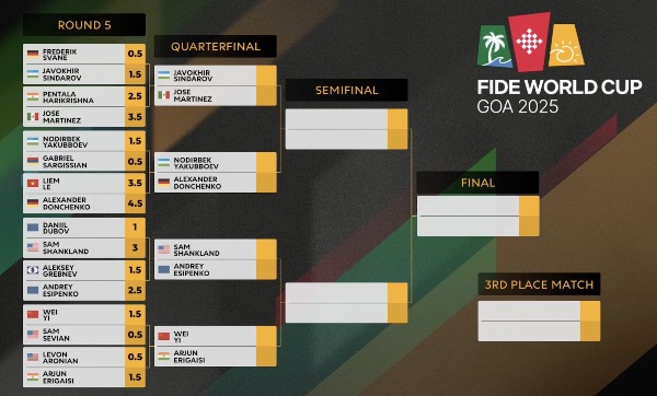 FIDE World Cup v indické Goi má po dnešku osm čtvrtfinalistů. Čtyři zápasy, které se po včerejších remízách v klasickém tempu přesunuly do tiebreaků, nabídly rychlé rozhodnutí: postup má Sam Shankland, Andrey Esipenko, José Martínez, Alexander Donchenko