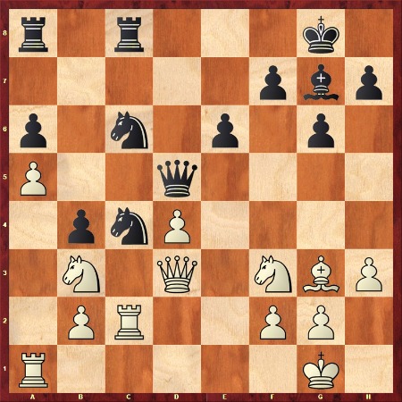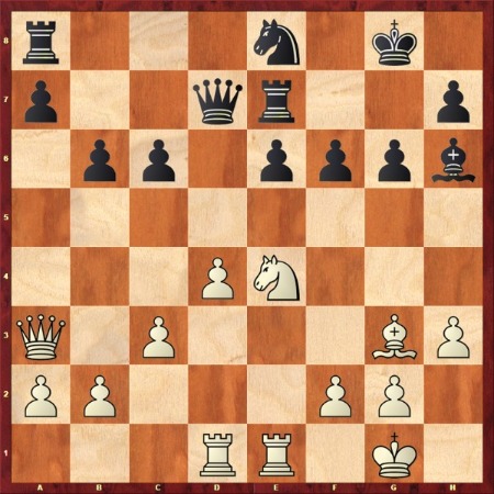 Čierny má prevahu po svojej obeti pešiaka 13. Jxe6 fxe6 14. Vxe6 d3!, po ktorom prišlo 15. Sxc6 bxc6 16. Se3 Sd4 17. Jc3 Dd7 a vežu na e6 čaká smutný osud po 18. Dxd3! Dxe6 19. Dxd4 Vad8.