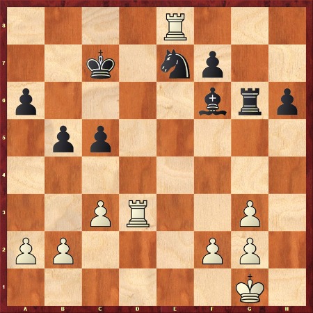 Biely stojí už podstatne lepšie, keďže po 24... Vd8 25. c4 f5? príde 26. Sh4, ktoré môže získať už materiál. Napr. po 26... Vf7 27. Sxd8 Dxd8 28. Jc3 stojí biely už určite na výhru.