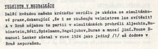 Partiář mi slavný velmistr nepodepsal, ale partie pozornost vzbudila. Podívejte se na několik materiálů z dobového tisku z archivu Honzy Kalendovského. Z brněnských simultánek se zatím dochovalo 8 partií (viz přehrávací okno).