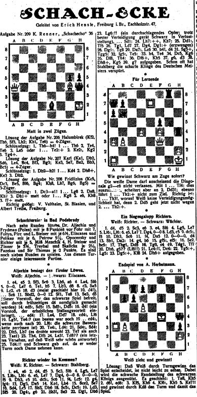 Kurt Richter (1900 - 1969) byl vynikajícím útočným mistrem, který vyznával superostrá zahájení. Stal se i pilným publicistou, který v různých časopisech glosoval aktuální partie a napsal několik čtivých knih, které jsou dodnes vydávány. Zajímal se o teorii a je autorem mnoha pozoruhodných nápadů, které nesou jeho jméno. Následující tři partie z novin Freiburger Zeitung z roku 1936 jsou malým obrázkem jeho útočné hry.