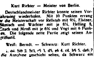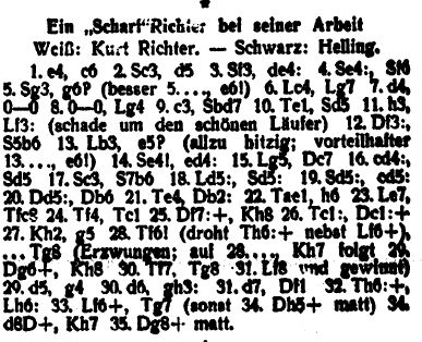 O komentátorském umění Kurta Richtera vypovídá krásná knížka Golz-Keres Schoenheit der Kombination, vydaná v Berlíně 1972. Jsou to jeho příspěvky pro východoněmecký časopis Schach, kde vedl rubriku "Hohe Schule der Schachkombination". Partie s Berndtem (uveřejnil Zuercher Illustrierte již 24.4.1936) a Hellingem (viz České slovo 30.5.1936) jsou z přeboru Berlína, Richter-Waechter se však nehrála v Lipsku, ale na turnaji ve Swinemuende, což byl přípravný turnaj Velkoněmeckého šachového svazu pro šachovou olympiádu v Mnichově Ten vyhrál Eliskases 7(9) před Richterem 6, W. Ernstem 5,5, B. Kochem 5, W. Langem a W. Michelem 4,5, Zollnerem 4, Ed. Hahnem, v. Hennigem 3 a Waechterem 2,5 bodu. Viz Deutsche Schachzeitung 1936, 198.