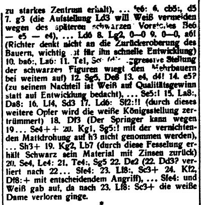 1.d4 d5 2.Jc3 Veresovův systém, černý hraje "klasicky francouzsky." 2...e6 3.e4 Jf6 4.Sg5 Se7 5.Sxf6 a bílý reaguje Andersenovým útokem, který byl jeho oblíbený. Častější je [5.e5] 5...Sxf6 6.e5 Se7 7.Dg4 0-0 8.Sd3 V rozmezí let 1928 až 1957 hrál podle mé databanky Richter takto 12x a dosáhl skóre +8 =2 -2! [8.0-0-0] 8...c5 9.dxc5 f5 [9...Jc6 10.f4 f5 11.Dh3 je přehození tahů.; Jedna ze známých partií je 9...Jd7 10.Jf3 Jxc5 11.0-0-0 Da5 12.Sxh7+ Kxh7 13.Dh5+ Kg8 14.h4 Ve8 15.Jg5 Sxg5+ 16.hxg5 Kf8 17.g6 fxg6 18.Dxg6 Sd7 19.Vh7 1-0 Richter - Darga, Berlín 1950] 10.Dh3 Jc6 11.f4 Da5 [Jinou možností je 11...b6 12.0-0-0 bxc5 13.g4 c4 14.Sxc4 fxg4 15.Dg2 Ja5 16.Vxd5 exd5 17.Sxd5+ Kh8 18.Sxa8 Sa6 19.Sd5 Db6 20.Jge2 Vb8 21.b3 Vc8 22.De4 Jb7 23.Ja4 Dc7 24.c4 Jc5 25.Jxc5 Sxc5 26.Vd1 Vf8 27.Kb1 Sc8 28.e6 a5 29.f5 Se7 30.Vg1 a4 31.Vxg4 axb3 32.axb3 Sf6 33.Jf4 De7 34.Dg2 g5 35.fxg6 Sg7 36.gxh7 Vxf4 37.Vxf4 Da3 38.Da2 Db4 39.Vf1 Dc3 40.Vd1 De5 41.Vg1 Dd4 42.Vc1 Sxe6 43.Sxe6 De4+ 44.Dc2 Dxe6 45.Vg1 De3 46.Vxg7 De1+ 47.Dc1 De4+ 48.Ka2 Kxg7 49.Db2+ 1-0 Pilnik - Stahlberg, Mar del Plata 1942.] 12.0-0-0 d4 Ještě [12...b6; 12...Sxc5] 13.Jb1 Dxa2 Keres považoval tento tah za dobrý. Jiné analyzované možnosti jsou: [13...Jb4 14.Sc4 Jxa2+ a) 14...d3 15.c3 Dxc5 16.Jd2 b5 17.cxb4 Dc7 18.Dxd3 Sb7 19.Dc3 bxc4 20.Jgf3 Sd5 21.a3 a5 22.bxa5? (22.b5! Db7 23.Jd4 a4 24.Jc6 Sxc6 25.bxc6 Dxc6) 22...Db7! 23.Jf1 Vfb8 24.Vd2 Sd8! 25.Vc2 (Některé databanky uvádí pokračování 25.Ve2 Sxa5 26.Dd4 c3 27.Jg3 Db3) 25...Sxa5 26.Dd4 c3 27.Jg3 Db3 0-1 Endzelins - Lidacis, Litva 1952.; b) 14...Dxc5! Doporučovala ECO.; 15.Sxa2 Dxa2 Firmenich - Unterbusch, kor. 1943.] 14.g4 [Jiná ukázka hezkého útoku je 14.Jf3 Jb4 15.g4 Da5 16.Vd2! Sxc5 17.Vg1 Sd7 18.gxf5 Jxd3+ 19.Vxd3 Vxf5 20.Jg5 h6 (20...Vxf4 21.Dxh7+ Kf8 22.Je4!) 21.Jxe6! Sxe6 22.Dxh6 Dc7 23.Vh3! Sf8 24.Dxe6+ Vf7 25.Dh6 1-0 Barasz - Breyer, Budapešť 1913.] 14...b6 15.gxf5 exf5 16.Je2 bxc5 Černý stojí už velmi dobře. 17.Vhg1 Diagram