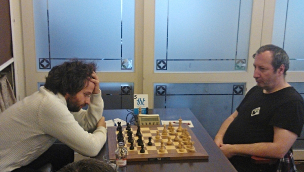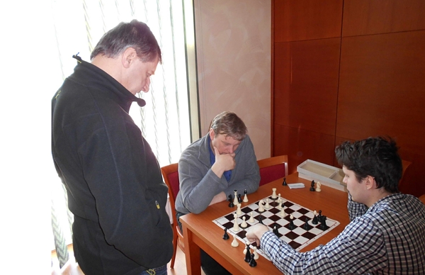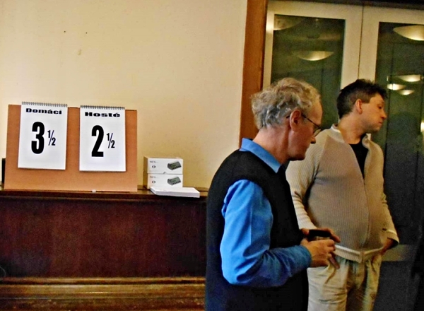 Vláďa (i když bez pěšce) hraje remízovou koncovku, a tak musíme vyhrát na čtvrtý, aby jsme zachránili alespoň bod. Zdá se, že to půjde, ale Pavel Šimáček začíná partii, jak se nám opticky jeví, otáčet ve svůj prospěch. Navíc Paklez má silnou časovku.
