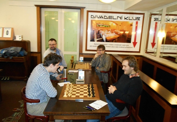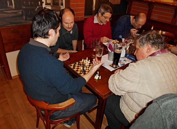 Sedíme ve stylové hospůdce - pardon tam již zavřeli - takže sedíme ve stylovém baru: Aleš, Víťa a já s Lukášem Klímou a Honzou Malíkem a „kujeme“ plány. Vyhrát více než jednu partii je asi sci-fi, takže odremizovat sedm partií a vsadit vše na výhru Jirky (do té doby 6 ze 7)? A nebo? No vše je teorie ...