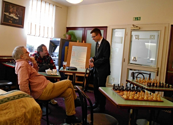 U pozdního obědu „Šimi“ analyzuje partii a mezi sousty hledá výhru, kterou se mu ovšem najít moc nedaří ... No byla to zapeklitá pozice …