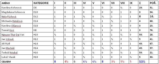 Celková bilance –1 není příliš lichotivá, i vzhledem k tomu, že po šestém kole jsme měli +7. Zde je však potřeba dodat, že v mínusu skončily především nejmladší kategorie (s výjimkou Nguyena), tudíž starší kategorie skončily celkově v plusu.