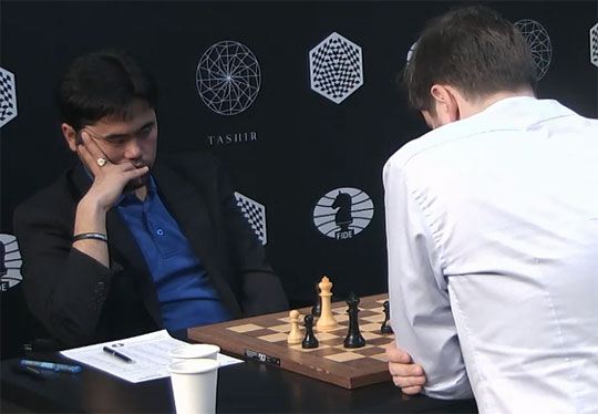 Pěšce získal i druhý lídr, Viši Anand. Ten však jediný nevypadal moc bojovně naladěn (soudě podle opakování tahů, které bílými nabízel), nenašel úzkou cestu k výhodě a Fabiano Caruana jej dobral zpátky a přešel do remízové koncovky.
