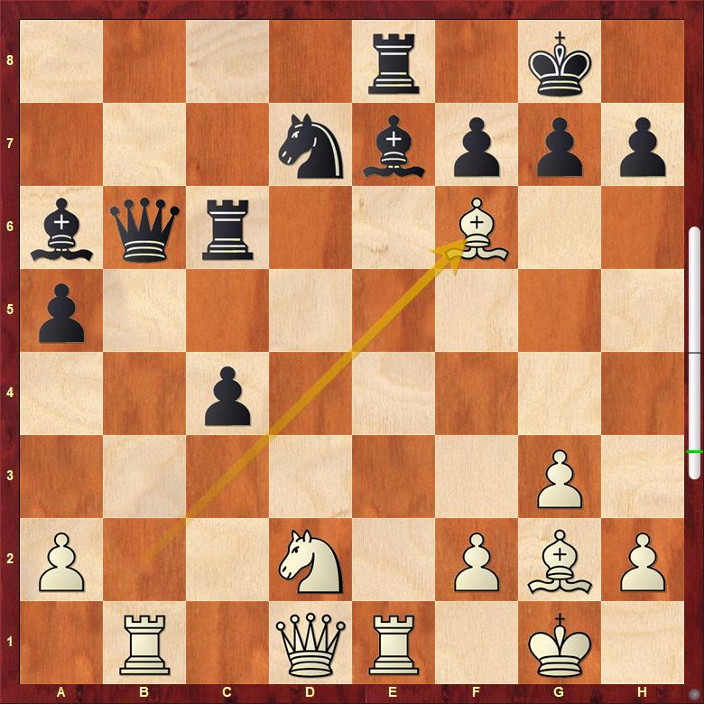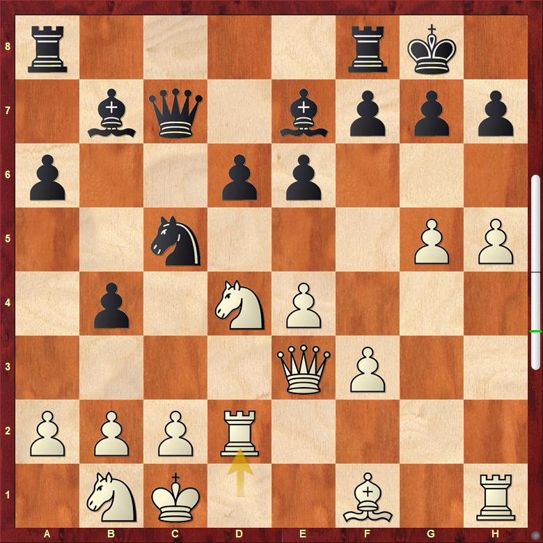 21... Dxf2+!! Čiernemu sa podarilo nájsť takéto rozuzlenie partie. 22. Kxf2 Sc5+! Toto je jediný ťah. Nevyhnutné je zapojiť do útoku, čo najviac figúr. 23. Kf3 Vxf6+ 24. Kg4  Je5+! Opäť jediné pokračovanie. 25. Kg5? Biely mal už obetovať kvalitu na e5, ale stal by beznádejne. 25... Vg6+ 26. Kh5 f6 27. Vxe5 Vxe5+ 28. Kh4 Sc8 Pekná partia na útok a figúry.