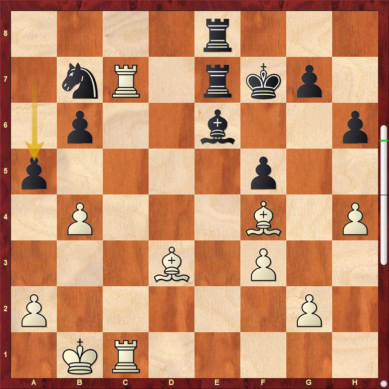 31. Sb5! Bielemu stačí na výhru toto silné pokračovanie a je koniec. Čierny bude mať o figúru menej po 31... Vd8 32. Vxe7+ Kxe7 33. Vc7+ a čiernemu padá jazdec.