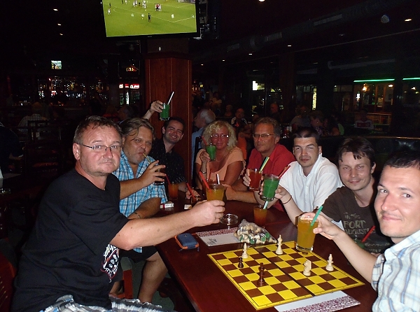 Výborná bulharská kuchyně, kterou jsme povětšinou konzumovali v „naší“ oblíbené restauraci „Red and White“ vzdálené od hracího sálu 27 kroků (sleva 30% z veškerého sortimentu pro naši skupinu také nebyla k zahození), stejně jako půl litru piva za 1 leva = cca 14 Kč na dobré pohodě rovněž neubraly. Večer pak vyrazit na karaoke, či do baru na koktejly, takže na přípravu na soupeře do příštího kola již bohužel příliš času nezbývalo….. Naštěstí se hraje bez dvojkol, takže i takto nabitý program se dá přežít.