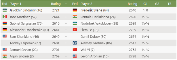 Když se podíváme na výsledky prvních partií 5. kola, je jasné, že se hráči navzájem dobře znají a nikdo nechce zbytečně riskovat. Remízy najdeme všude, kam se podíváte – Martínez s Harikrishnou, Sargissian s Jakubbojevem, Dončenko s Liêmem, Shankland s Dubovem… jeden solidní výsledek vedle druhého.