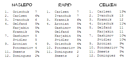 Celkový vítěz IVANČUK. Část "Blind" vyhrál Griščuk, část "Rapid" Ivančuk.