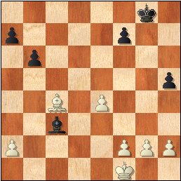 1.d4 Jf6 2.c4 g6 3.Jc3 d5 4.cxd5 Jxd5 5.e4 Jxc3 6.bxc3 Sg7 7.Sc4 c5 8.Je2 Jc6 9.Se3 0-0 10.0-0 Dc7 11.Vb1 b6 12.Sf4 e5 13.Sg3 De7 14.Sd5 Sb7 15.Da4 Vfc8 16.dxe5 Jxe5 17.Jf4 c4 18.Vfd1 V této pozici se ještě nic moc neděje. Černý možná udělá nejlépe, když zahraje 18...Vd8 s přijatelnou pozicí. Jenomže doposud skvěle hrající Ponomariov zavelel k aktivní hře tahem... 18...h5? Diagram č.9 Přišlo však velmi silné:19.Jxg6!! velmi pěkný trest za oslabení pole g6 19...Jxg6 20.Sd6 nyní nejde vzít střelce pro Sxf7+ 20...De8 21.Dxe8+ Vxe8 22.Sxb7 bílý získal pěšce, ale ještě nebude snadné ho uplatnit pro slabost pěšce c3 a pak pro aktivního černého střelce a jezdce 22...Vad8 23.Sb4 Jf4 24.Kf1 Vxd1+ 25.Vxd1 Jd3 26.Sd5 Vc8 27.Vb1 Jxb4 28.Vxb4 Sxc3 29.Va4 Vc5 30.Vxc4 Vxc4 31.Sxc4 Diagram č.10 Vznikla nám krásná koncovka nestejnobarevných střelců, naprosto ukázková. Pro bílého je důležité, že má "dobrého střelce". Pokud by se černému podařilo dát střelce za bílé pěšce kr. křídla, nestačilo by mu to k remíze. Absurdní je, že kdyby měl černý o dva pěšce méně, tedy kdybychom odstranili pěšce dámského křídla (2 černí a jeden bílý pěšec), pozice by byla remiza... Ale tak je pozice za bílého vyhraná. Plán je udělat si 2 spojené volné pěšce a těmi projít do dámy či získat soupeřova střelce.31...h4 32.f4 Kg7 33.e5 f6 34.exf6+ Kxf6 35.g3 Plán splněn, bílý má dva volné pěšce, nyní se rozeběhnout za podpory krále a střelce do dámy. 35...Kf5 36.Sd3+ Ke6 37.Kg2 hxg3 38.hxg3 Kd5 39.Kf3 Kd4 40.Sa6 Kc5 41.g4 b5 42.g5 Kb6 43.Sc8 Kc7 44.Sf5 a5 45.Sd3 b4 46.Sc2 Kd6 47.Kg4 Sd2 48.f5 Ke5 49.f6 Se3 50.Kh5 Sc5 51.Kh6 Ke6 52.g6 Kd5 1-0