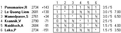 Hned úvodní kolo nabídlo pěknou podívanou. Mamedyarov porazil černými domácího Naiditsche a Ruslan Ponomariov bílými uspěl s Lékem. Ve druhém kole zvýšil ukrajinský reprezentant svůj náskok v čele tabulky trochu nečekanou výhrou nad obhájcem Vladimírem Kramnikem, který dokázal v dalších kolech vyhrát jen s nejslabším Naiditschem a v turnaji se spíše trápí. Třetí a čtvrté kolo znamenalo střídání stráží ve vedení tabulky a zase v tom měl prsty Ponomariov. Tentokrát ale díky prohře s Quangem Le přepustil vedení Mamedyarovi. V pátém kole, které bylo 100% rezultativní, si však Ponomariov sjednal pořádek a bílými porazil Mamedyarova. Svou druhou výhru zaznamenal vietnamský bojovník tentokrát nad Lékem, který se po polovině turnaje pasoval do role otloukánka.