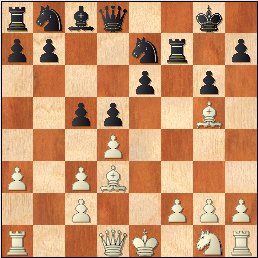 V této pozici zahrál černý zajímavou novinku: 12...e5!?N Ve svých databázích jsem jako nejčastější pokračování našel tahy 12...Jbc6 a 12...Da5. 13.dxe5 Jbc6 14.Sf6 Dc7 15.Jf3?! Logický vývin jezdce zde paradoxně není dobrý, díky následujícímu tahu získá černý pohodlnou hru. Opravdu by mě zajímalo, co měl černý připraveno po 15.f4!? 15...Sg4 16.Se2? A to je prakticky rozhodující chyba, nutné bylo 16.0-0 se stále přibližně vyrovnanou pozicí. 16...Sxf3 17.Sxf3 Jxe5 18.Sxd5 I po 18.Sxe5 Dxe5+ 19.Kf1 Dxc3-/+ není bílému co závidět. 18...Jxd5 19.Dxd5 Jg4 20.Sh4 Ve8+ 21.Kd1 21.Kf1 Je3+-+ 21...Jxf2+ Bílý ztrácí minimálně věž.