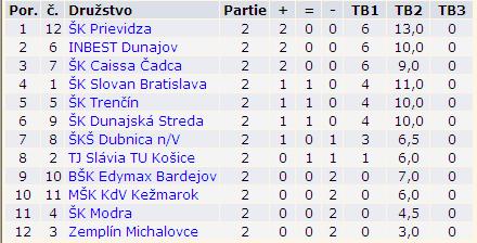 Během uplynulého víkendu byla odehrána první dvě kola nejvyšší slovenské soutěže družstev. Stejně jako je letošní česká extraliga velmi vyrovnaná, o slovenské jsme už po prvním kole mohli říct pravý opak: výsledky 1x 7:1, 3x 6:2, 1x 5,5:2,5 a pouze 1x nejtěsnější výhra 4,5:3,5. Tedy ani jedna remíza. Až ve druhém kole skončila dvě utkání nerozhodně. Na čele se hned po startu usadil loňský obhájce prvenství Prievidza, která nejen že dvakrát vyhrála, ale dokázala nabrat skóre 13 bodů, což ze dvou zápasů vůbec není málo.