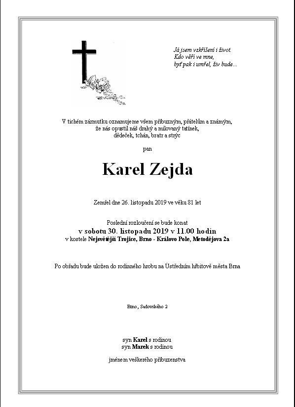29.11.2019 16:56Smutná zpráva dorazila z ŠK 64 Brno. 26. listopadu ve věku 81 let zemřel dlouholetý brněnský hráč Karel Zejda – každý, kdo v Brně hrál šachy, se musel s tímto sympatickým, korektním a přátelským člověkem na nějakém turnaji potkat. Čest jeho památce!
